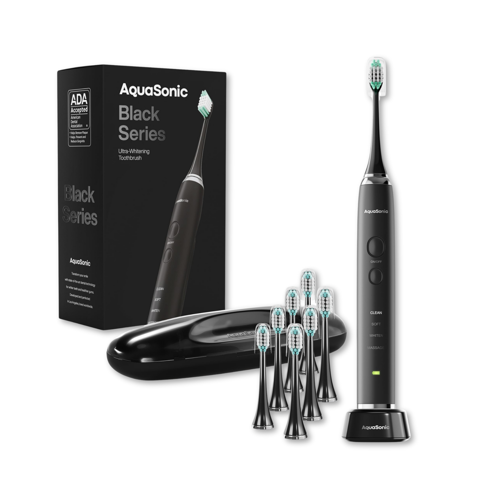 - What's in the Box - 1 AquaSonic Black Series Smart Toothbrush, 1 wireless charging base, 8 DuPont Brush Heads, 1 Travel Case, Instruction and Support Contact Manuals