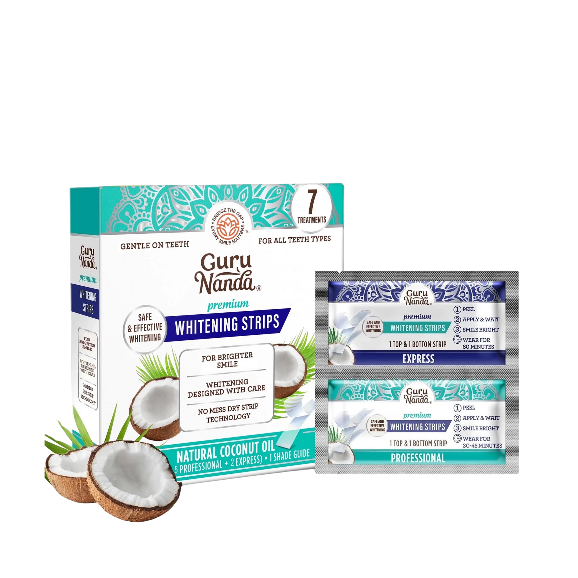 - Reveal a brighter smile with GuruNanda Teeth Whitening Strips. Our dry-strip formula combines hydrogen peroxide with soothing coconut extracts, helping to break down stains & whiten teeth.