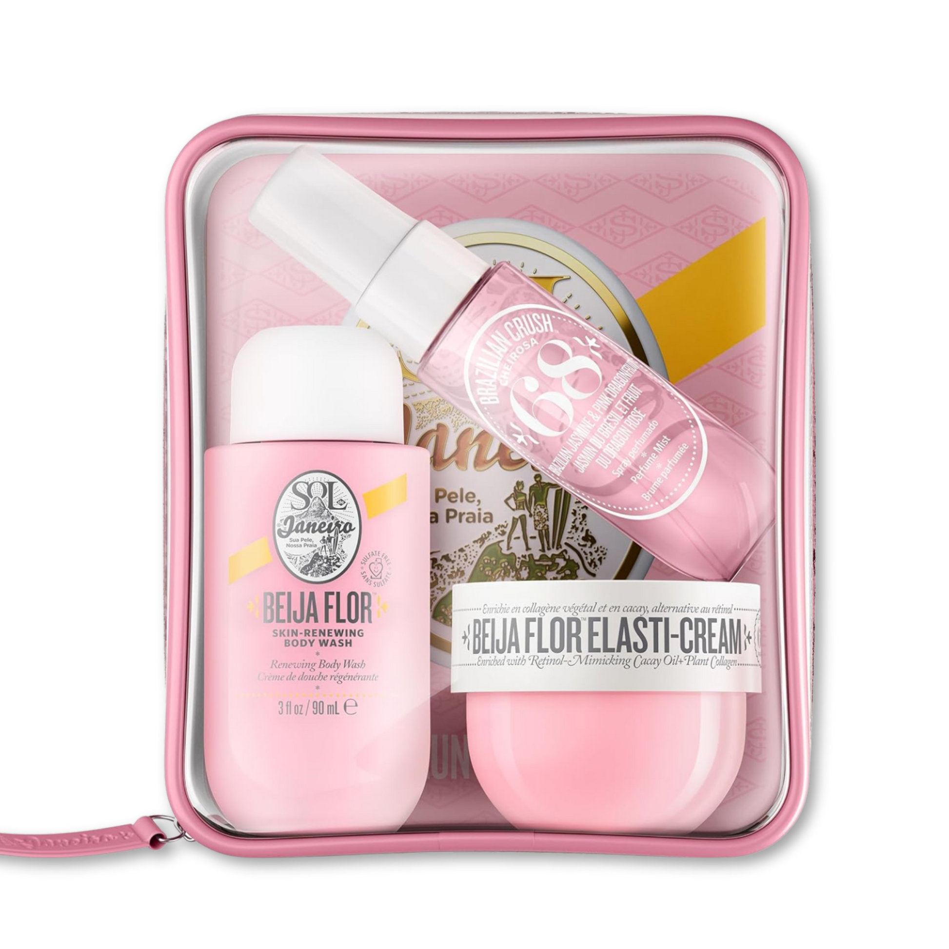 Your travel-friendly routine for visibly smoother skin. Start by cleansing with Beija Flor Body Wash, then smooth on collagen-boosting* Beija Flor Elasti-Cream. Finish with the bright scent of Cheirosa 68 Perfume Mist.